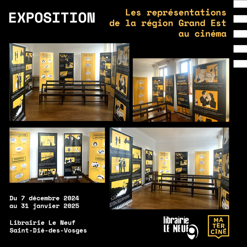 Du 7 décembre 2024 au 31 janvier 2025, Materciné s’installe dans les locaux de la librairie Le Neuf à Saint-Dié-des-Vosges avec son exposition « Les représentations de la région Grand Est au cinéma ».