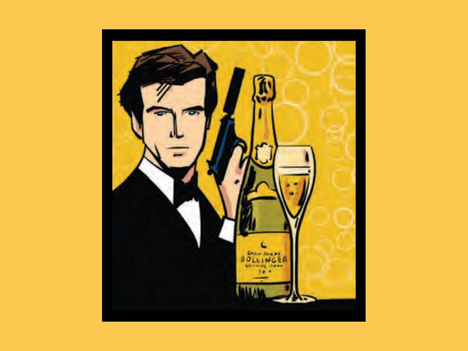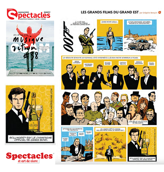 Ce mois-ci, le dessinateur a choisi d’illustrer la saga James Bond et finit sa planche sur le Champagne Bollinger.